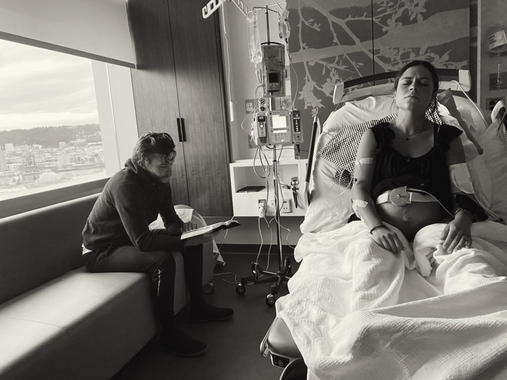 This time in Portland, Oregon, we settled into our state-of-the-art birthing suite, where we couldn’t hear a pin drop and had a view of evergreen trees in the distance. The doc came to check my cervix and dilation straight away to have a good induction plan. He reported that I was 1 cm dilated and would start with the foley balloon. I asked if they could do some miso (a cervical ripener instead), but I realized VERY early on they did not want ANY baby being born before 7 AM. I was not too fond of the idea of a foley and was SHOCKED I would need one with my third baby. I asked them to recheck me in a different position. I was convinced I was further along than they said, and sure enough, I was 3 CM instead of 1 just 5 minutes later.