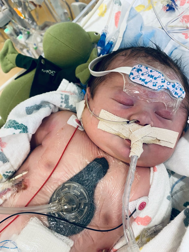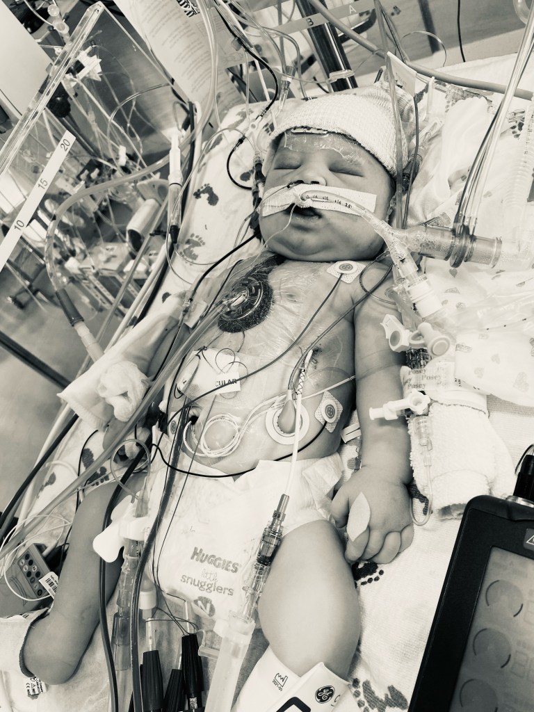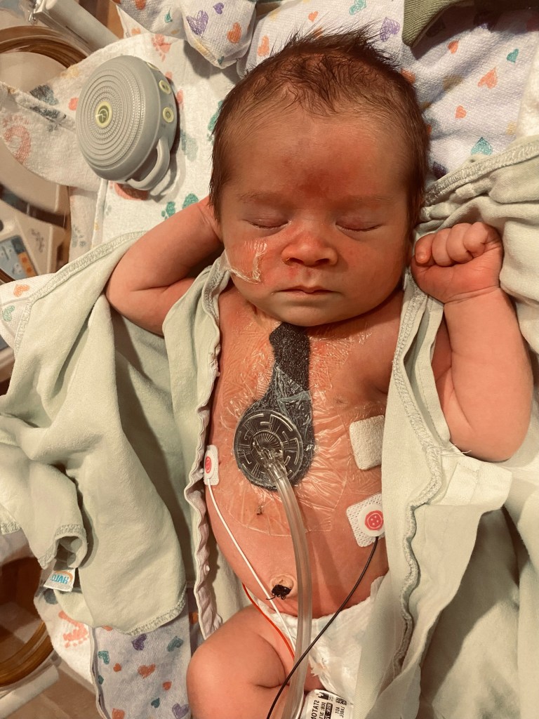 Amos was intubated minutes after birth and emergently received a balloon to keep his little body alive until his open-heart surgery. I was able to hobble my way down to the NICU at 3:00 AM when he was finally stable. I was in such a daze after scarfing an entire pizza and dozing in and out of sleep, waiting for the nurse to call me to give me the green light to go down. Tyler stayed the night in his NICU room, and after just a few short moments, I walked myself back up to the postpartum floor. Amos was already covered in lines, on a breathing tube/ventilator, and pumped with narcotics to help keep his pain at bay. He was only hours old, and already so much had happened in his little life. The first time I held him, he was three days old. I will never forget how much I cried when it took three nurses to hand him to me. They wrapped his cords around my neck. I felt such deep sadness it’s hard to describe. Sure, I was so grateful that I was surrounded by amazing doctors and nurses that had kept him alive, but I felt more anger and sadness than anything.